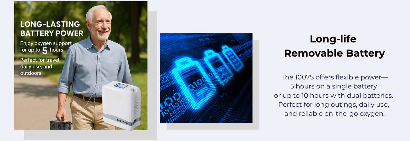 1007S offers dependable oxygen therapy in a compact form, empowering users to travel, work, and relax confidently—breathing easier, living better, and enjoying life without limitations or boundaries.