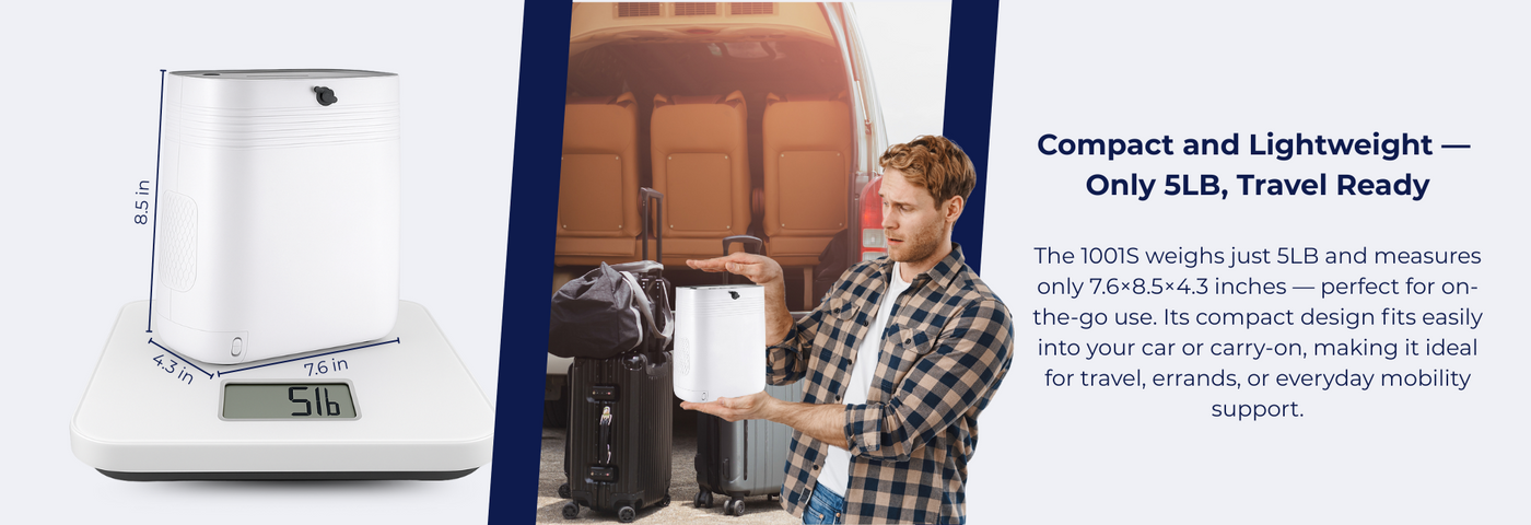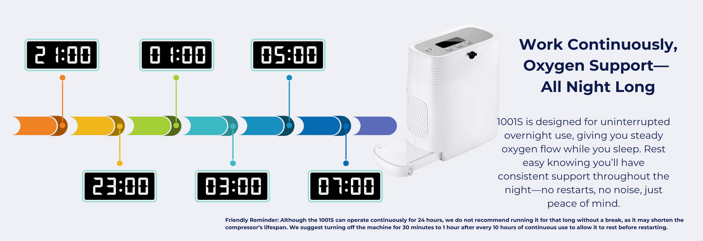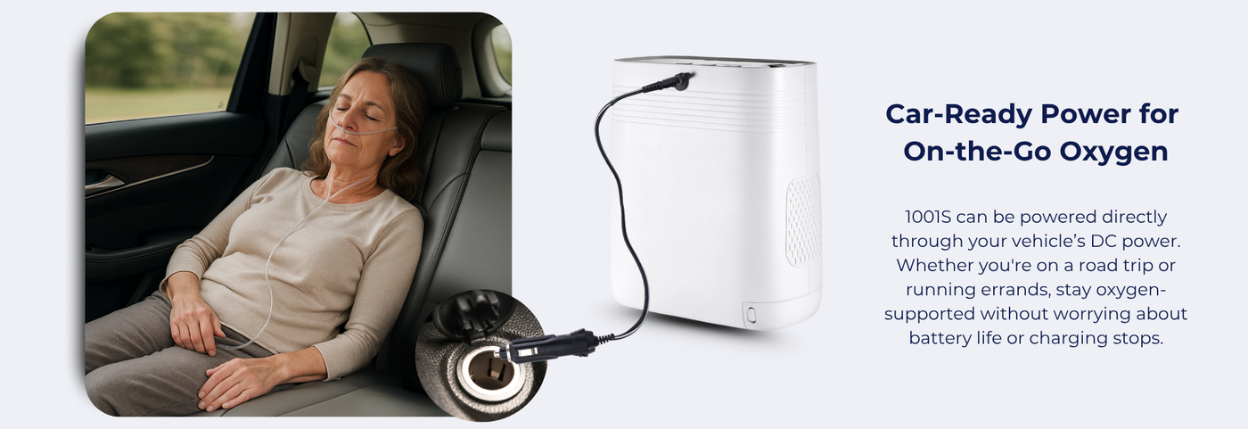 1001S runs ≤45dB, making it ideal for use at home, in the car, or even while sleeping. Enjoy reliable oxygen support without the distraction of loud machine sounds.